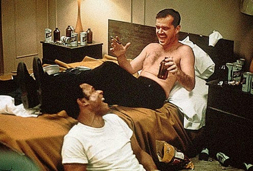 Now there’s one scene in particular where the three get a hotel room for the night because they got too drunk and missed their train. When they arrive at the hotel room, I’m truly convinced that the director, Hal Ashby, simply set up the camera, provided his actors with a few dozen beers, and let them loose. It’s basically just the three of them shooting the shit, watching war movies on tv, teaching semaphore codes, arguing, all whilst chugging back beers. The acting is too good for them not to be drunk. In my opinion, it’s the greatest depiction of a boys’ night in, especially as it ends with them drunkenly sleeping on uncomfortable cots. It’s an all-time scene in a truly all-time film.